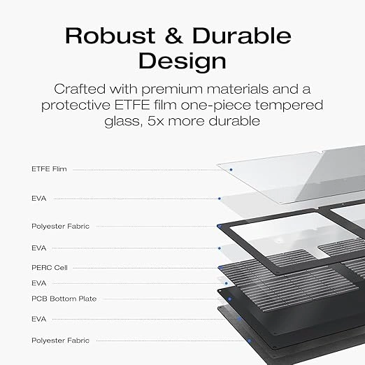 صُممت لوحتنا الشمسية المحمولة بقدرة 60 واط لتحمل مختلف الظروف البيئية، من الرطبة والمبللة إلى الجافة والمغبرة. وبفضل تصنيفها العالي لمقاومة الماء IP68 وغشاء ETFE الواقي، تستمر الخلايا الشمسية في جمع الطاقة حتى أثناء هطول الأمطار الغزيرة.